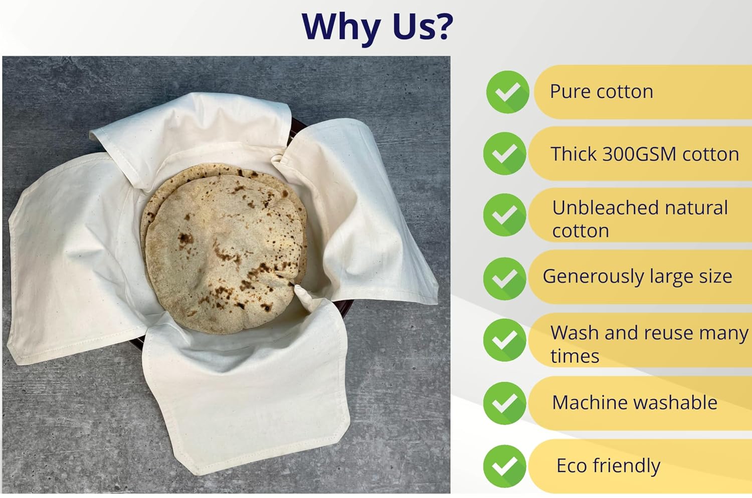 Made Of Thick 2 Layers of Pure Cotton Muslin Fabric To Keep Chapati Warmer And Soak Water Generated From Steam In Casserole